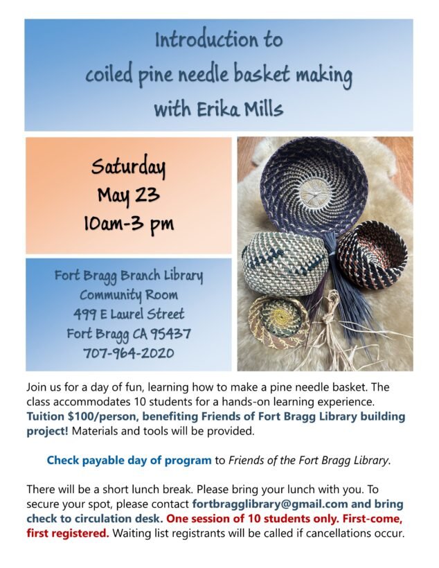 Join the Friends of the Fort Bragg Library for a day of fun, learning how to make a pine needle basket. The class accommodates 10 students for a hands-on learning experience. Tuition $100/person, benefiting Friends of Fort Bragg Library building project! Materials and tools will be provided.