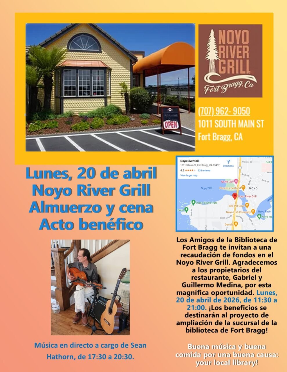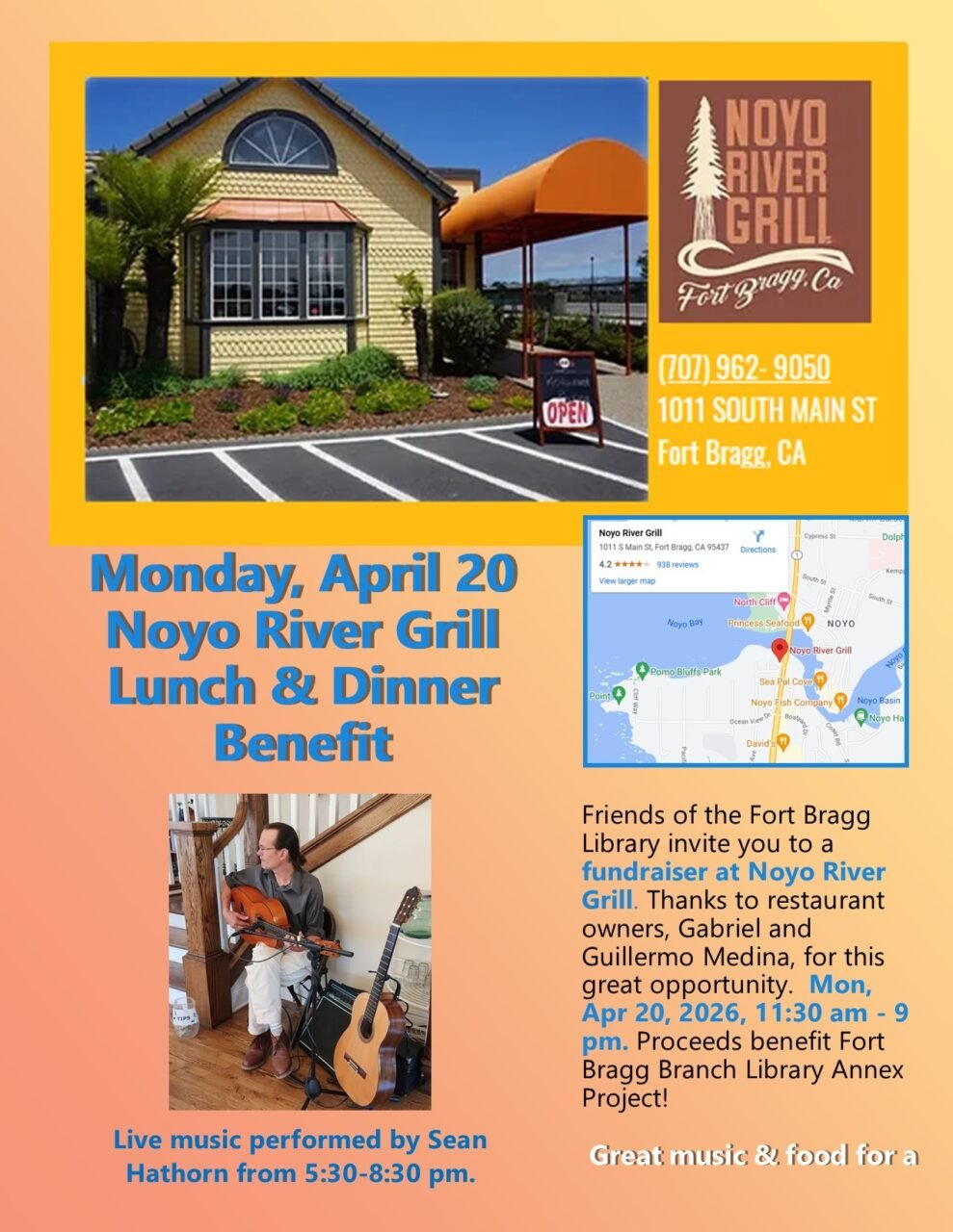 Lunch & Dinner benefit at Noyo River Grill for Friends of the Fort Bragg Library Annex Project. Fantastic food with a world class view! Plus wonderful music!