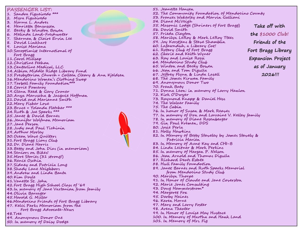 Now is the time to jump on board and be a part of our library’s new growth. I challenge you to join me in the $1000 Club to expand the Fort Bragg Library.