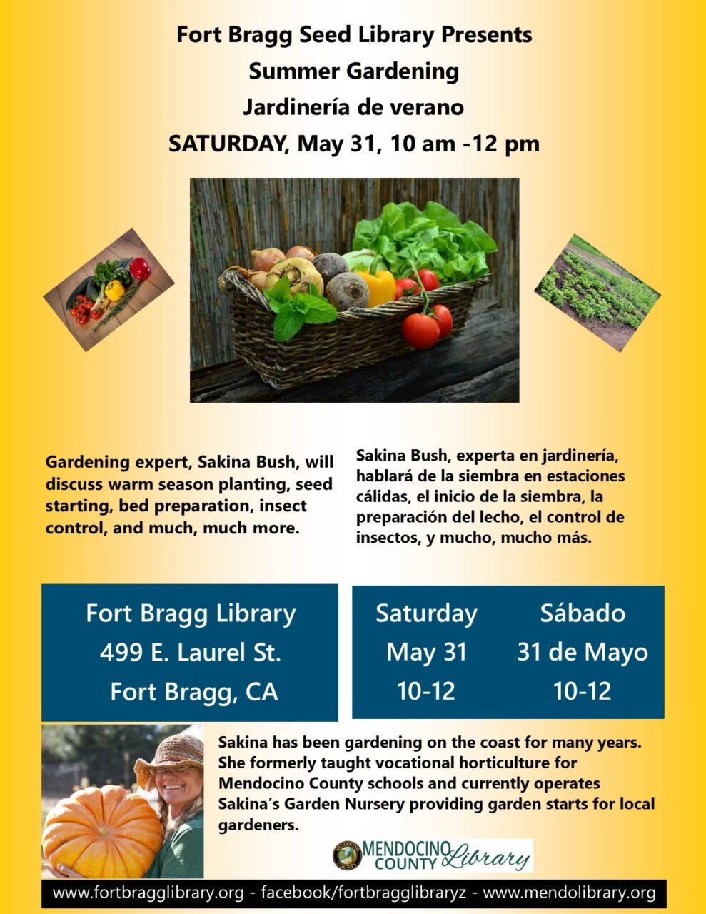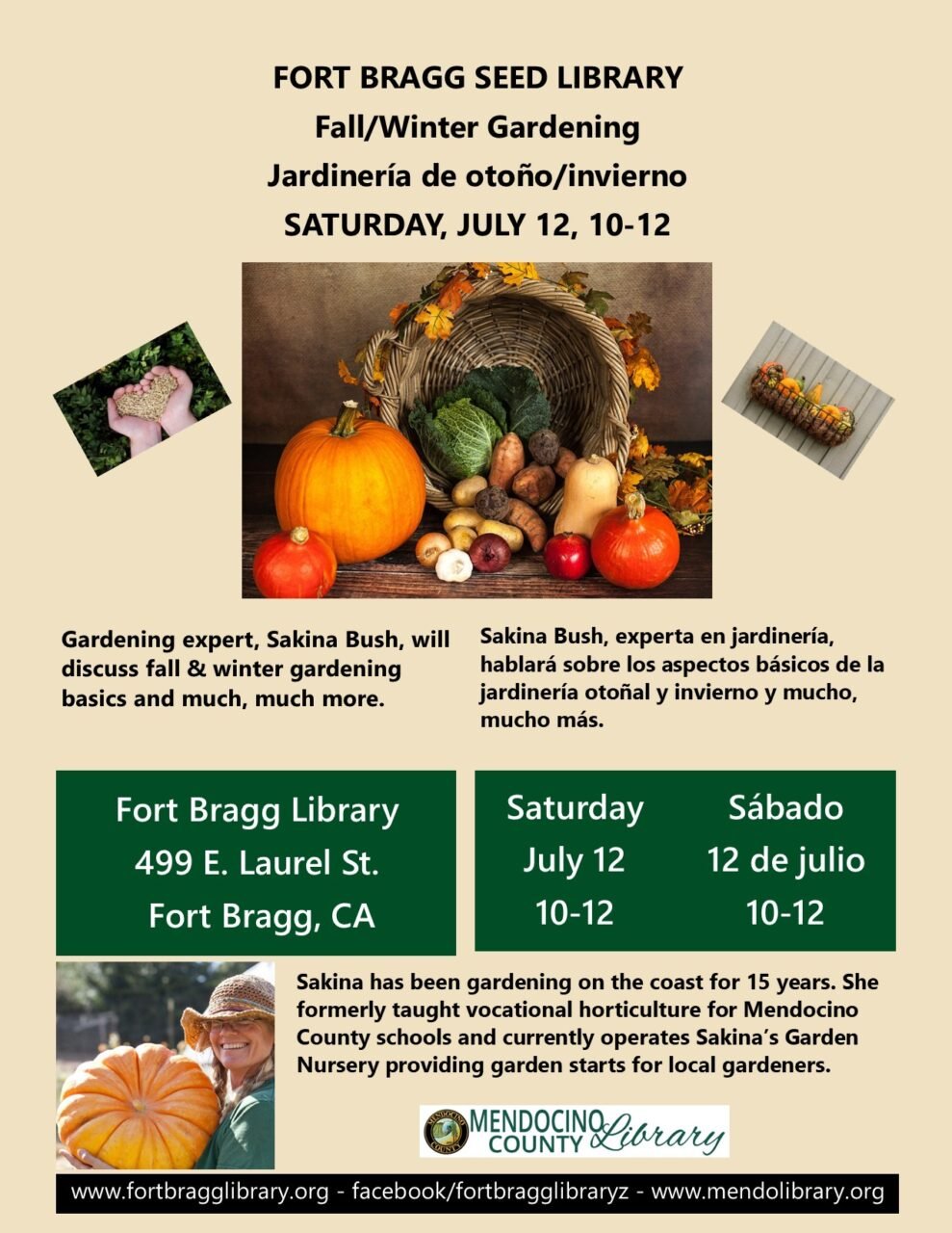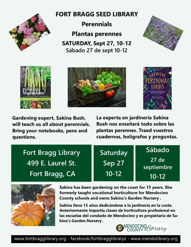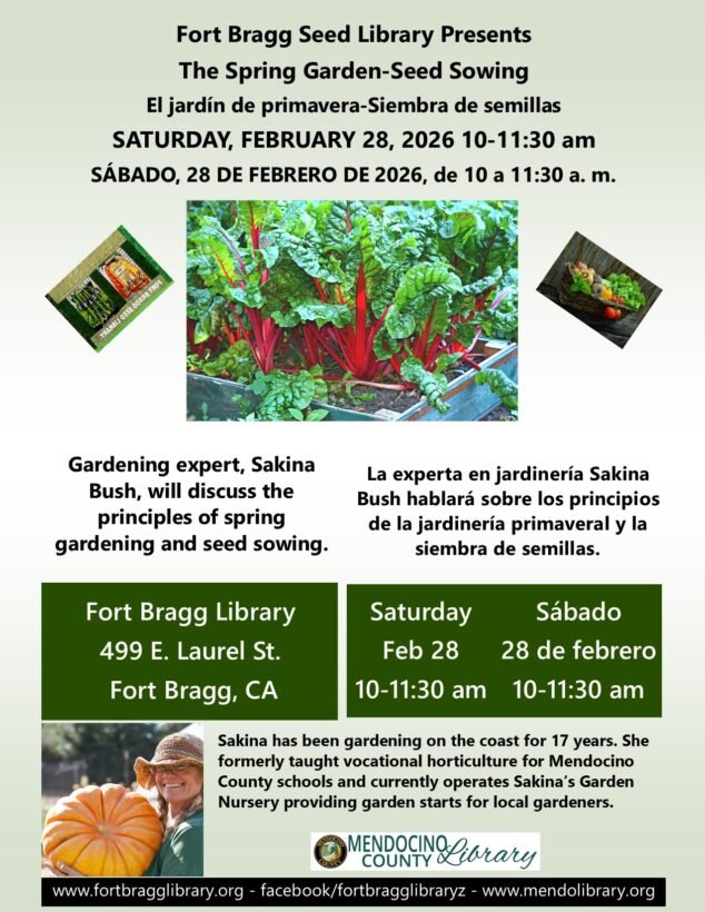 Jamie’s appearance is sponsored by Book to Action, Friends of the Fort Bragg Library and the Fort Bragg Seed Library.